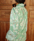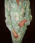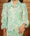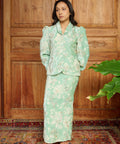 Crafted from a blend of rayon, viscose, and linen with a soft chiffon-blend lining, the kebaya features a folded neckline and puff sleeves finished with elastic cuffs. The matching skirt is designed with a side zip and buckle fastening, complemented by an elasticated waistband for a comfortable and composed fit.