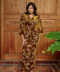 Crafted in printed velvet with a soft chiffon-blend lining, the kebaya features a folded neckline and softly puffed sleeves finished with elastic cuffs. The matching skirt is completed with a zip and buckle fastening, an elasticated waistband, and a soft pink lining that subtly lifts the floral print.