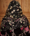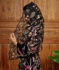 Crafted from lace, it features an embroidered hem finished with delicate beadwork for added texture and refinement. The generous length allows for flexible styling, whether draped loosely or styled with structure.